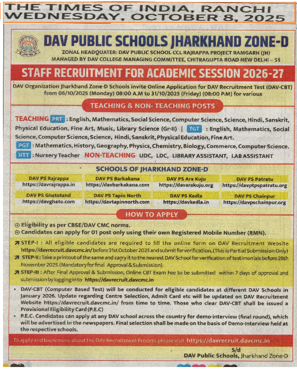 D.A.V Rajrappa, an English medium co-education school under the aegis of DAV College Managing Committee, New Delhi, was established in 1982 in collaboration with Central Coalfields Limited. The school began its services to the community with a motto to instill in the students, moral and Vedic values, imbibe scientific temperament and ignite the young minds to be creative & innovative.